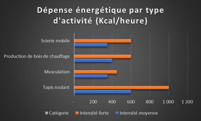 En comparant les résultats de diverses études sur la dépense énergétique versus les activités traditionnelles reliées à la production de bois de chauffage ou encore à la production de bois scié à l’aide d’une scierie mobile, on peut constater que la dépense énergétique est au moins équivalente à celle provenant d’activités reliées aux salles d’entrainement, mais, en plus, les activités reliées au travail du bois génèrent un produit tangible en plus de permettre à la personne de profiter de la nature loin des distractions du Web. La figure 1, qui suit, illustre la comparaison de ces activités. Bien entendu, les fourchettes de valeurs pour les dépenses énergétiques varient selon l’intensité qu’on y consacre. À notre humble point de vue, il est toujours plus facile d’y mettre toute notre intensité lorsqu’on sait, qu’à la fin, on obtiendra une ou deux cordes de bois pour chauffer la résidence ou le chalet plutôt qu’un rond de sueur au sol autour du tapis roulant !